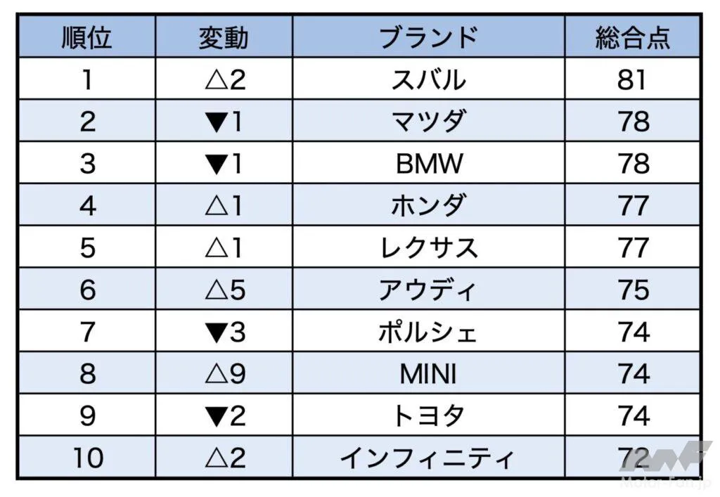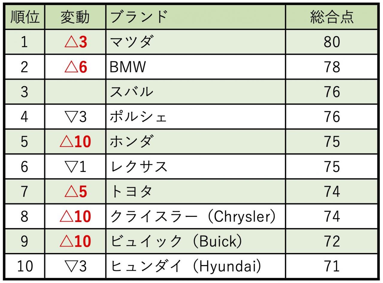 マツダ、スバル、ポルシェ が再びトップブランドになりました。