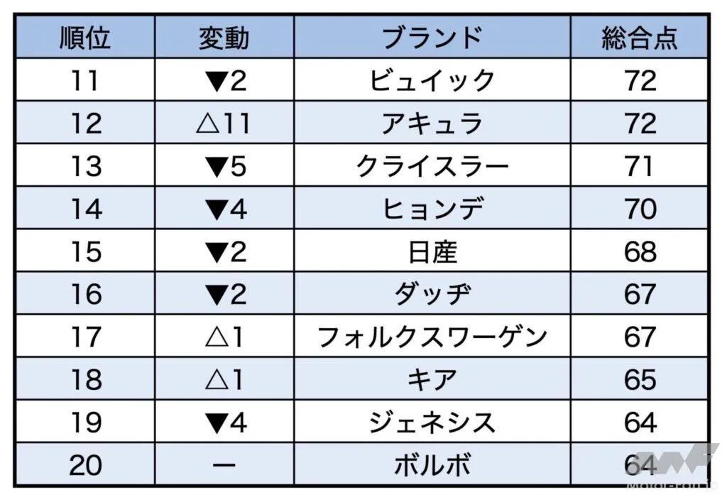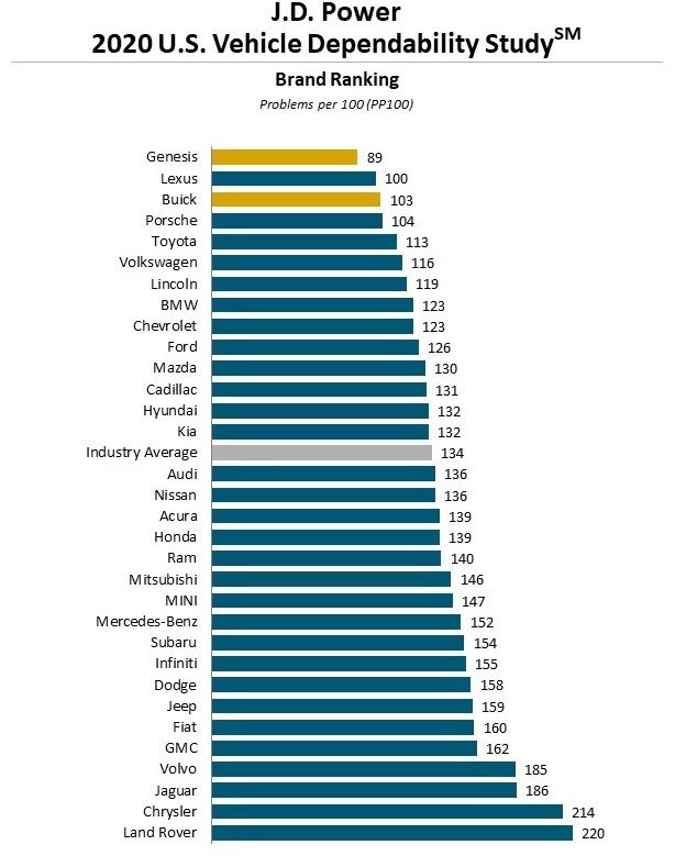ホンダは、信頼性の向上に支えられて、トップ5に10スポット増加し、最も改善を示しました。(2台を除くすべてのホンダの信頼性は平均以上です。)BMWも今年トップ5にランクインしました。クライスラーと ビュイックの2人の獲得者は、製品ラインの段階的な改善とライバル。高級ブランドの ジェネシスとリンカーンは、予測された信頼性が標準以下であるため、それぞれ最大の落ち込みを記録しました。