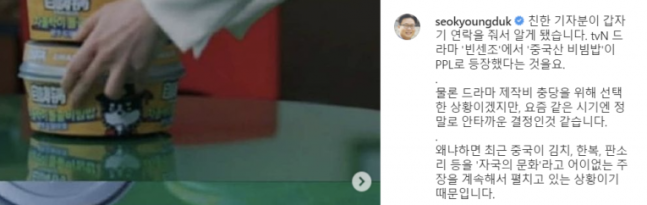 韓国広報専門家の誠信(ソンシン)女子大学の徐京徳(ソ·ギョンドク)教授は16日、インスタグラムに「最近、中国がキムチ、韓服、パンソリなどを"自国の文化"とあきれた主張を続けている状況」とし「最も懸念されるのは、中国語で書かれた使い捨て容器に入ったビビンバが海外視聴者には中国料理と誤解を招く可能性があるということ」と明らかにした。