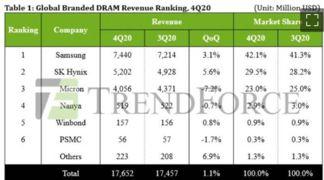 1coco2021/04/04(Sun) 15:59:30ID:U4MDgyNDQ(1/1)NG報告삼성전자와 SK하이닉스가 지난해 4분기 메모리 반도체 DRAM 시장에서 72%에 달하는 시장 점유율을 기록한 것으로 나타났다.>>2>>3>>15>>31>>530