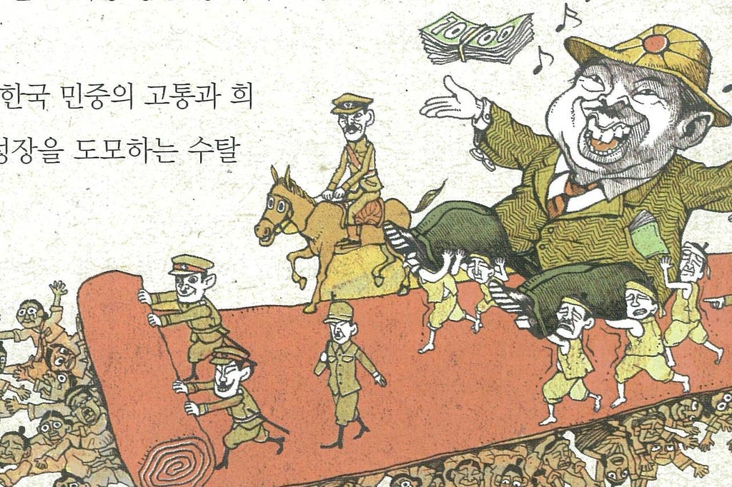 1910年から45年、そして2010年代まで続く、植民地化された韓国国民の痛みの上で富を拡大する日本人の様子を紹介する韓国の高校教科書