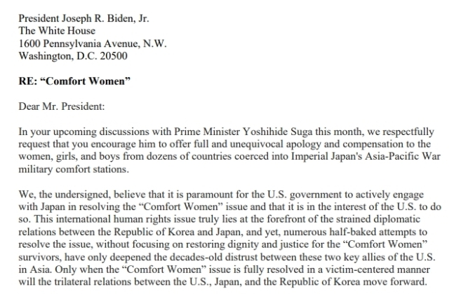 컬럼비아와 스탠포드, 예일 등 14개 대학의 아시아 태평양 법대 학생회가 함께한 이 서한에서 학생들은 바이든 대통령에게 "스가 총리에게 위안부 피해자들을 향해 완전하고 분명하게 사과하도록 권유해달라"고 요청했다.