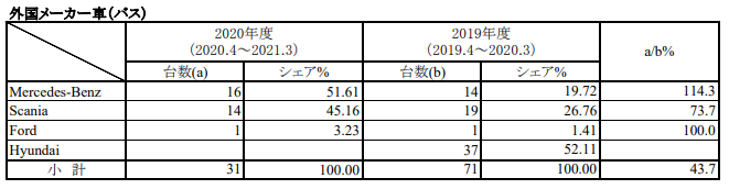 一方で、他の外国メーカーの販売台数は、ヒュンダイほどの大きな変動がない。同期間、日本の輸入バスの販売台数は、メルセデス・ベンツが前年比14%増の16台、スカニア(scania)が27%減少の14台、フォードは1台で、これら三社計31台が売れ、前年の71台より57%減少した。