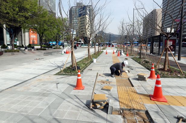 去る5日午後2時。ソウル鍾路区世宗路交差点光化門ビル前報道。工事人夫5〜6人が歩道ブロックを蹴っていた。ソウル市は昨年下半期から光化門広場を西に拡張する「広場の再構造化」工事とソウル駅〜世宗路交差点報道を広げる「世宗路人の森」工事を進めている。光化門ビルの前に広げた報道に歩道ブロックを敷く工事を終えたのは、昨年12月末。工事を終えたか、3ヶ月しかならなかったが、再工事をすることだった。した現場作業者は、「歩道ブロックが行が合わず高低がバラバラな部分があって蹴って再び敷いている」とした。