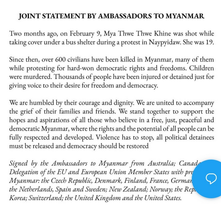 17개국 대사들은 오늘 공동 성명을 내고 “600명 넘는 민간인이 미얀마에서 살해 당했으며, 그들 중 많은 사람들이 힘들게 얻은 민주적 권리와 자유를 위해 항의하다 숨졌다”며 군부의 강경 진압을 규탄했습니다.