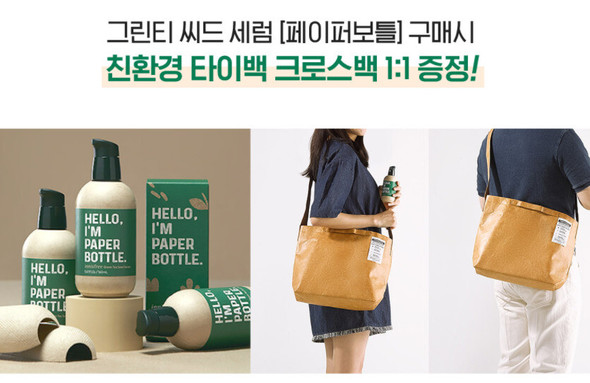 この製品の表面には、商品名が入る場所に「Hello, I'm Paper Bottle」と書かれている。紙の容器であることを前面に打ち出したエコ・ブランディングだ。イニスフリーのオンラインモールでは、最近まで160ミリリットルの大容量商品を買うと「エコクロスバッグ」がもらえるというマーケティングも行っていた。消費者は「容量も大きくて環境にやさしいペーパーボトルなので満足しています」「ケースが環境に配慮する材質なのも良いですね」「イニスフリーは環境に配慮するアイテムが多くて好き」などのレビューを残した。