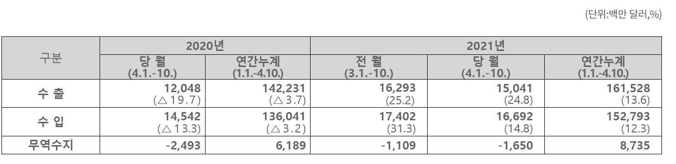 『韓国 関税庁』公式サイト「21年4月1日~4月10日輸出入現況」