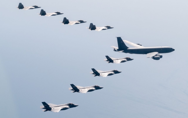 주일 미공군은 지난 1일 미 공군 제 199전투비행대 소속 F-22 스텔스기들과 KC-135 공중급유기, 일본 항공자위대(항자대) 소속 F-35A 스텔스기들의 연합 비행훈련 영상을 공개했다. 공개된 영상에 따르면 미 공군 F-22 편대(4대)와 일본 항자대 F-35A 편대(4대) 등 총 8대의 양국 스텔스 전투기들이 미 공군 KC-135 공중급유기와 함께 비행을 했다.