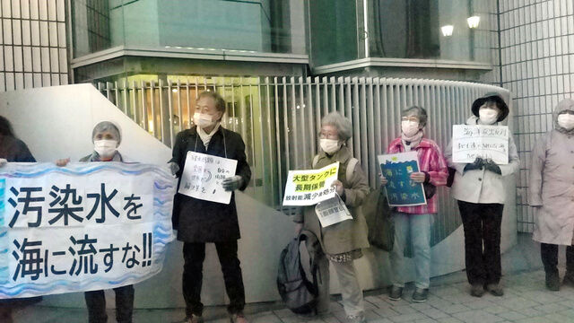 東京電力福島第一原発にたまる処理済み汚染水について、海洋に放出して処分する政府の方針が13日に決定する。12日夜、JR福島駅前には農業者や学者ら約50人が集まり、「海洋放出反対」「大型タンクに保管」などと書いたプラカードを掲げ、反対を訴えた。