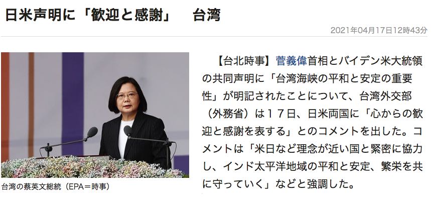 日米首脳会談、台湾海峡の平和と安定の重要性で一致と菅首相