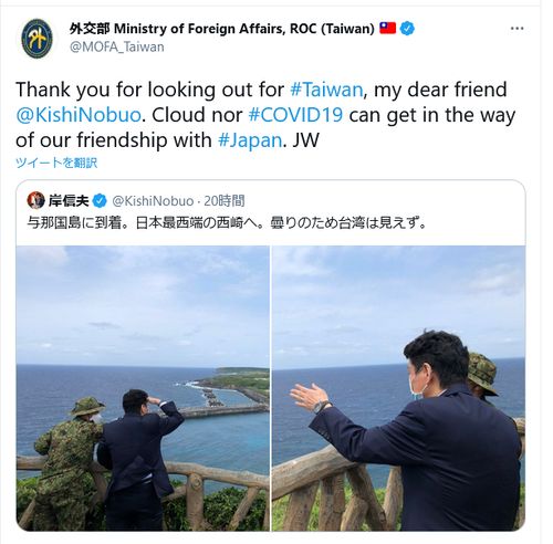 (台北中央社)日本の岸信夫防衛相が17日、ツイッターを更新し、視察先の沖縄県・与那国島から台湾を探す姿の写真と共に「曇りのため台湾は見えず」と投稿した。呉釗燮(ごしょうしょう)外交部長(外相)は同日、これを引用ツイートし、「台湾を探してくれてありがとう」と英語で感謝。さらに「台湾と日本の友情が曇りや新型コロナウイルスによって妨げられることはない」とつづった。