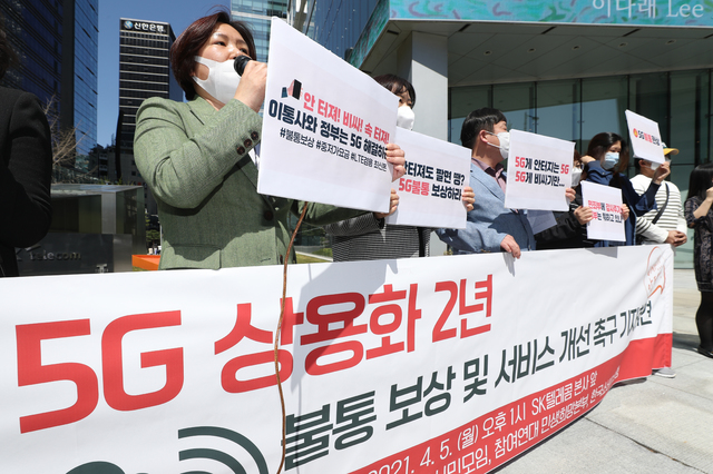 今月2日午前、ソウル市中区乙支路のSKテレコム本社「Tタワー」前で「5G被害者」による集会が開かれた。参加者らは「移動通信事業者が5Gの全国ネットワークの構築すらまともに行わず、高額の5G料金プランに加入させた。家が完成していないのに、家賃を受け取るようなものだ」と憤った。彼らは移動通信3社を相手取り、5G料金プランに関する集団訴訟を準備中だ。