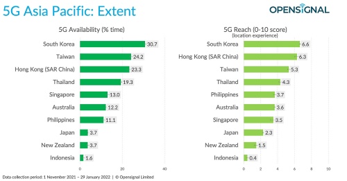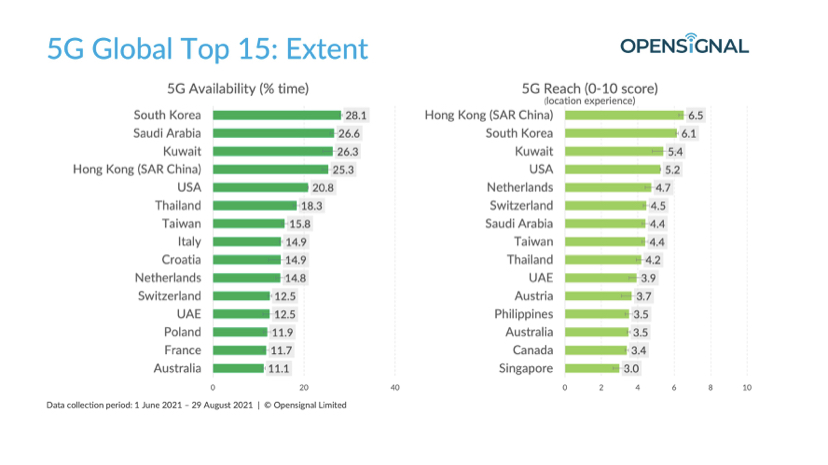 韓国では、通信時間の30.7%で5G接続できており、世界でも有数の5G可用性を実現している。