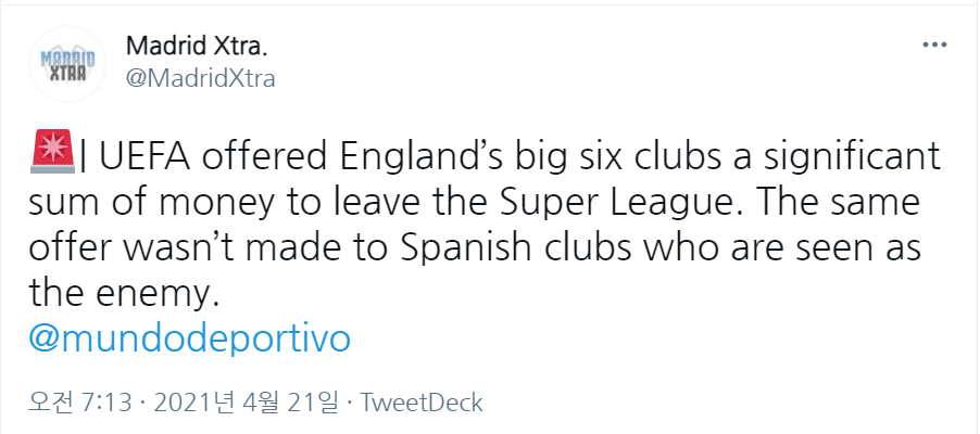 https://twitter.com/talkSPORT/status/1384580215016460288想定外の猛反発受け、ESLプロジェクトは消滅か…現時点で半分の6クラブが撤退決断か