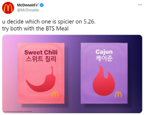 ディッピングソースにもハングルが記される。辛味が好きな韓国人を意識して韓国マクドナルドが開発したスイートチリとケイジャンのソースだ。マクドナルドは、ハングルで「スイートチリ」「ケイジャン」と記されたソースを公開し、「どちらの方が辛いか26日に決定できる」「BTSセットと全部試してみて」とコメントした。