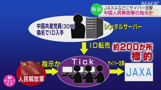 これまでの捜査で、サイバー攻撃はハッカー集団「Tick」が、中国の人民解放軍の指示で行ったとみられ、JAXAのほか防衛関連の有力企業など、およそ200にのぼる研究機関や会社が標的になったということです。