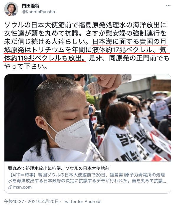 門田隆将「ソウルの日本大使館前で福島原発処理水の海洋放出に女性達が頭を丸めて抗議。さすが慰安婦の強制連行を未だ信じ続ける人達らしい。日本海に面する貴国の月城原発はトリチウムを年間に液体約17兆ベクレル、気体約119兆ベクレルも放出。是非、同原発の正門前でもやってください。」惨敗の韓国。