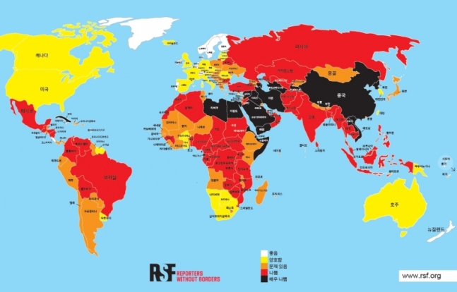 아시아에서 ‘언론지수 양호’를 기록한 국가는 올해도 한국과 대만(43위)이 유일했다. 일본은 지난해보다 하락한 67위를 나타냈다. 국경 없는 기자회는 한국·대만·뉴질랜드(8위), 호주(25위)를 가리켜 “아시아태평양 지역 언론 자유의 모델이다”라고 호평하며 “이들 국가들은 전반적으로 언론인들의 임무 수행을 막지 않고, 언론인들이 정보를 전달할 때 정부 당국의 주장이 들어가도록 강요하지 않는다”고 밝혔다.