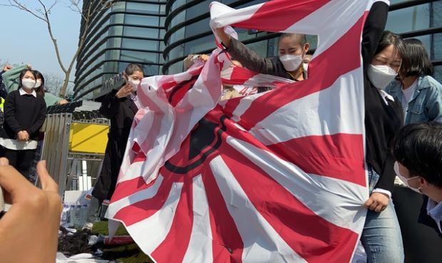 韓国の市民団体、駐韓日本大使館前で剃髪式と旭日旗引き裂きパフォーマンス…原発処理水放流抗議