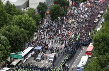 15日午後、ソウル汝矣島公園で民主労総と韓国進歩連帯、全国農民会総連盟など進歩団体で構成された全国民衆行動主催で開かれた「民衆総決起」