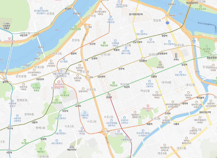 ・幹線循環バス(茶色の下)=ソウル外郭循環高速道路(100号線)、当然、バス亭は少ない、 2,700ウォン