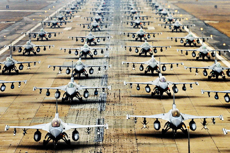 F-16 Fighting Falcons demonstrate an "Elephant Walk" as they taxi down a runway during an exercise at Kunsan Air Base, South Korea, on March 2, 2012. The air crews are assigned to Kunsan Air Base and various bases around the U.S. as well as one group from the South Korean air force.F-16 Kunsan AB Elephant Walk