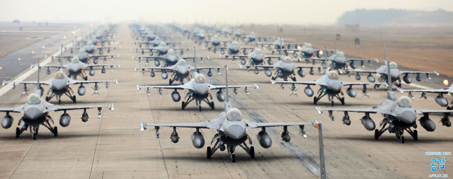F-16 Fighting Falcons from the 35th and 80th Fighter Squadrons of the 8th Fighter Wing, Kunsan Air Base, Republic of Korea; the 421st Expeditionary Fighter Squadron of the 388th FW at Hill Air Force Base, Utah; the 55th EFS from the 20th FW at Shaw AFB, S.C.; and from the 38th Fighter Group of the ROK Air Force, demonstrate an “Elephant Walk” as they taxi down a runway during an exercise at Kunsan Air Base, Republic of Korea, March 2, 2012. The exercise showcased Kunsan AB aircrews' capability to quickly and safely prepare an aircraft for a wartime mission.>>22