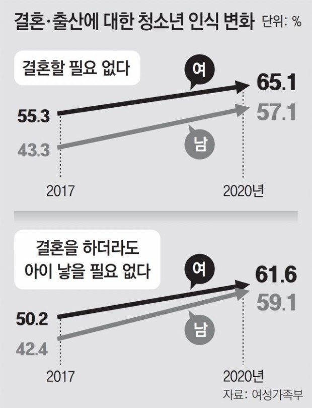 韓国の青少年10人中6人が、このように結婚と出産は必要でないと考えていることが分かった。成人の「非婚」や「非出産」の認識が青少年にまで広がる様子を見せている。女性家族部は21日、このような内容の「2020青少年総合実態調査」の結果を発表した。