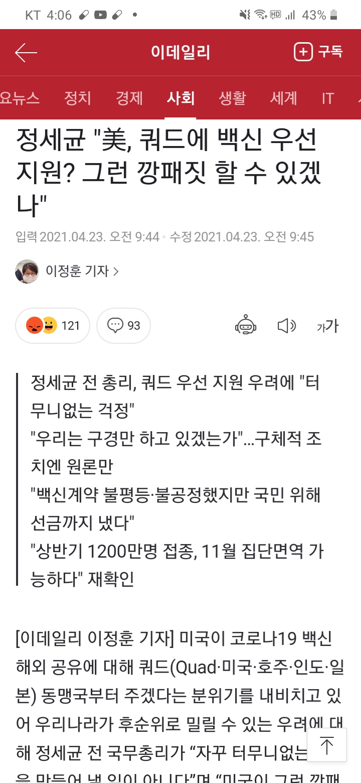 정 전 총리는 23일 CBS 라디오 `김현정의 뉴스쇼`에 출연, 미국이 백신을 쿼드 동맹국에 우선 지원할 수 있다는 우려에 대해 “그렇게 자꾸 터무니없는 걱정을 만들어낼 일은 아니다”며 “미국이 어떻게 그런 깡패짓을 할 수 있겠습니까”라고 말했다. 이어 “우리도 미국의 동맹국”이라며 “우리가 미국한테 원조를 받는 것도 아니고 그냥 공짜로 달라는 것도 아니고 사오는 것으로 제약회사들과 계약이 다 돼 있다”고도 주장했다.