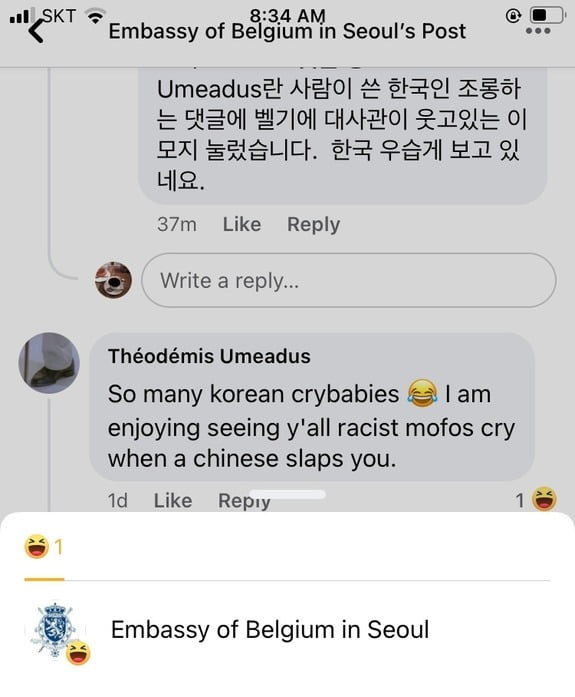 "중국인이 한국인 뺨 때려 즐겁다" 글에 '웃겨요' 누른 벨기에 대사관