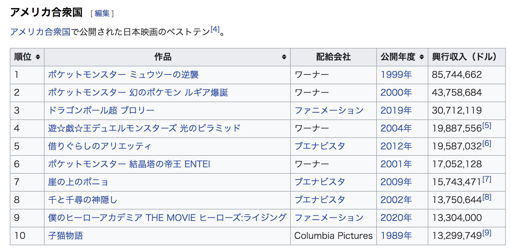 10億円以上のものだけでもこれだけある。日本映画以外は1作品のみ。