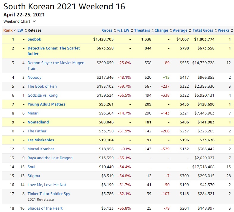 代わりに、Box office Mojo による韓国の興行収入最新週データを貼っておきます。