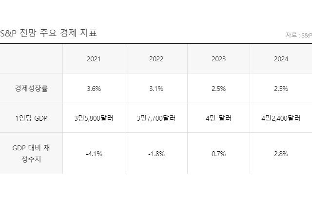 S&P는 한국이 올해 3.6%의 성장률을 기록한 뒤에도 안정적인 성장세를 유지할 것으로 예상했다. 이를 바탕으로 2023년에는 1인당 GDP 4만 달러, 2024년에는 4만2,400달러까지 늘어날 것으로 전망했다.