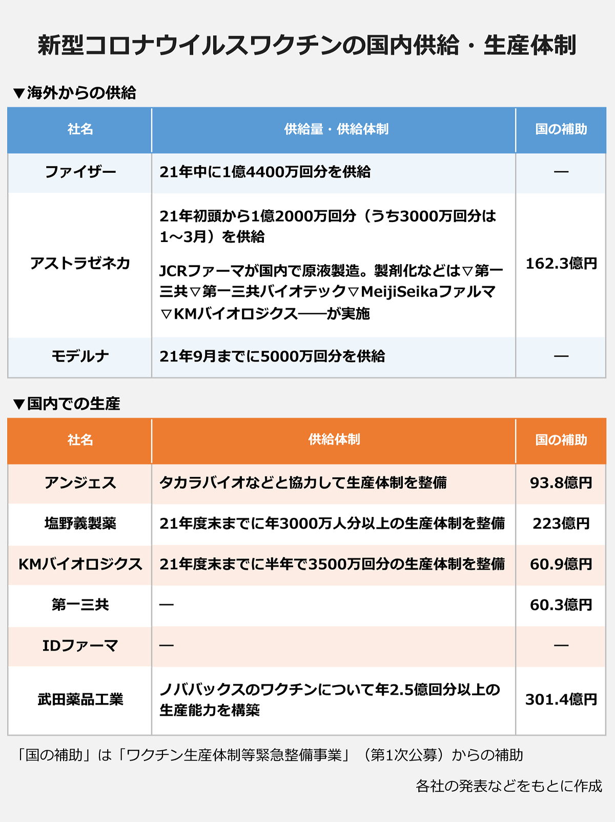 開発と並行して、生産体制の整備も進められています。政府は2020年度の第2次補正予算に、生産設備などの費用を補助する「ワクチン生産体制等緊急整備基金」として1377億円を計上。昨年の第1次公募では、▽アストラゼネカ▽アンジェス▽塩野義製薬▽KMバイオロジクス▽第一三共▽武田薬品工業――の6社に総額900億円あまりが助成されました。