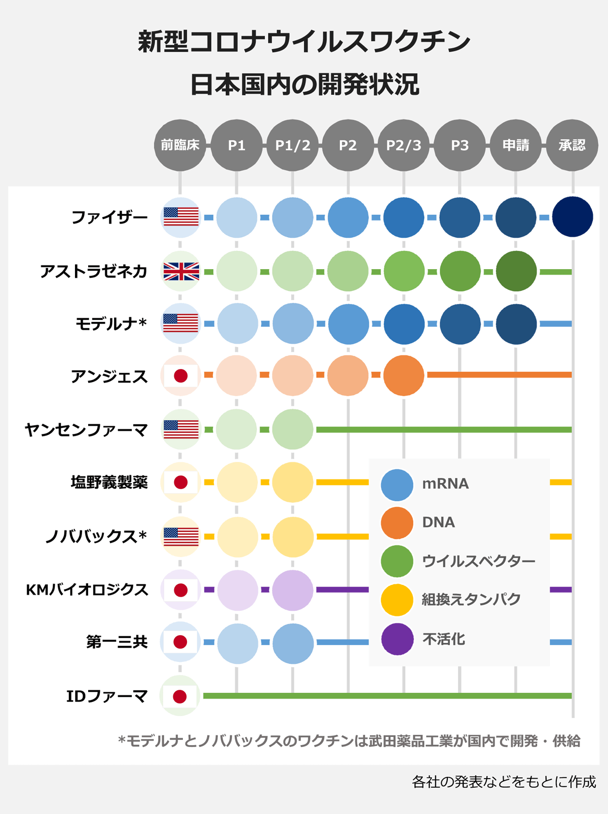 日本企業では、アンジェスがDNAワクチンのP2/3試験を行っていて、塩野義製薬は組換えタンパクワクチンのP1/2試験を実施中。KMバイオロジクスと第一三共も3月からP1/2試験を行っています。>>90