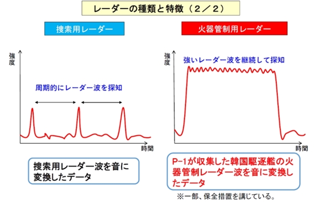 韓国駆逐艦から発せられた「火器管制用」と「捜索用」の2種類の音源を公表した。(火器管制用が継続的に音声が続くのに対して、捜索用は断続的に音が鳴っている)図