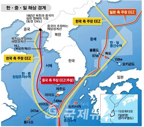 (図、オレンジが日本の主張のEEZ、黄色が韓国の主張するEEZ)