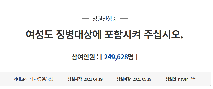 병역의 의무를 남성에게만 지게 하는 것은 매우 후진적이고 여성비하적인 발상이라고 생각합니다