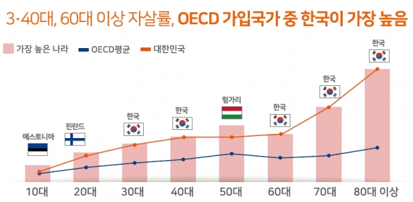 韓国(年齢別)年齢代別自殺率はOECD加盟国のうち、30代~40代、60代~80代の年齢層で最も高い