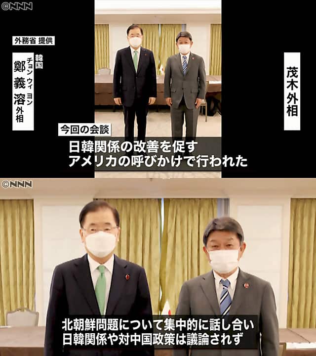 >鄭長官は会談後、聯合ニュースと会って"良い会話をした」とし「最後の夜、茂木外相と長い話していた」と述べた。 両国長官は過去の歴史と、北朝鮮の核などについて話を交わしたと思われる。