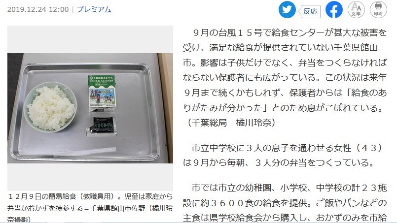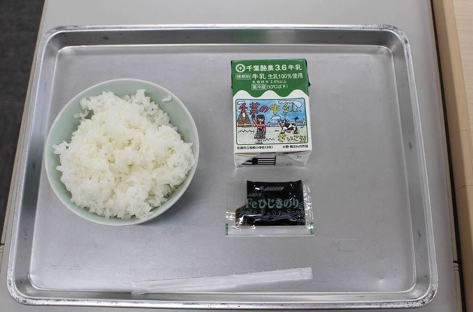 その給食は、台風の暴風雨で千葉県館山市の給食センターに被害が出だ時のもの。