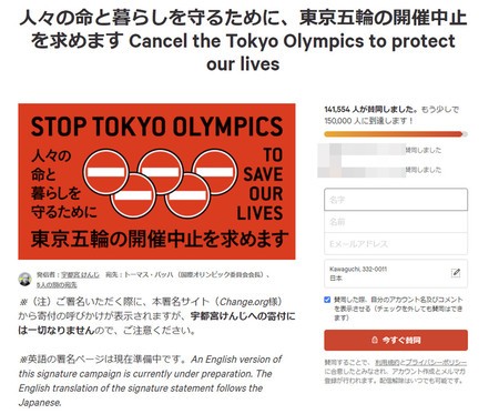 宛先は国際オリンピック委員会(IOC)のバッハ会長や菅義偉首相、東京五輪・パラリンピック組織委員会の橋本聖子会長らで、英語での署名ページも開設した。