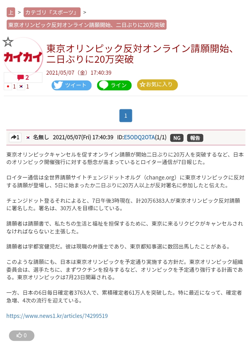 도쿄 올림픽 취소를 촉구하는 온라인 청원이 시작 이틀 만에 20만 명을 돌파하는 등 일본의 올림픽 개최 강행에 대한 우려가 고조되고 있다고 로이터통신이 7일 보도했다.