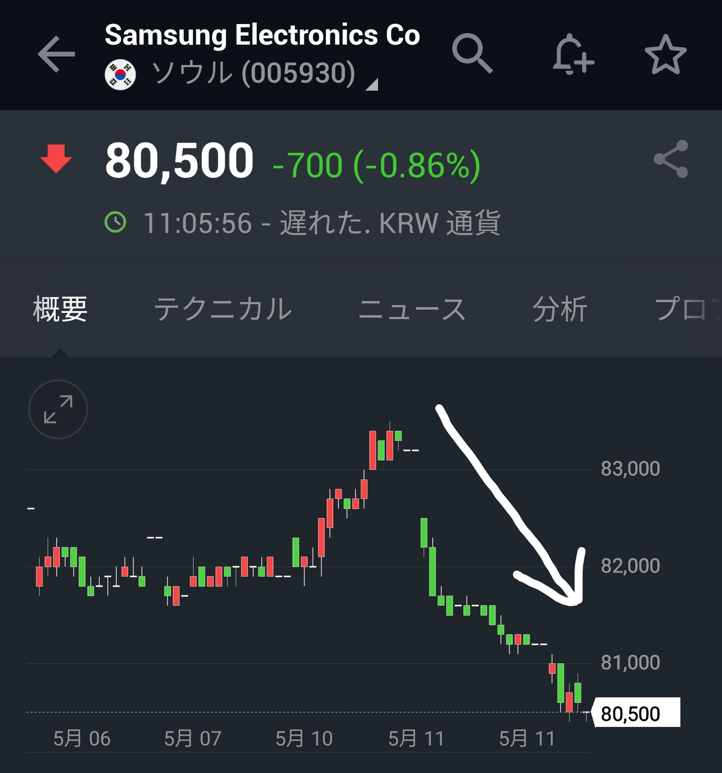 ポジティブニュースに全く反応せず下落するSAMSUNG株価
