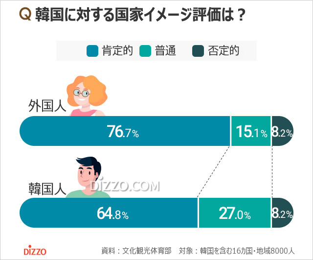 一方で、韓国に対するイメージが最も悪かった国は日本だった。肯定的な評価は27.6%にとどまり、否定的な評価は39%と他の国々(中国8%、米国・英国7.6%)に比べてはるかに多かった。理由としては、「韓国の政治状況」や「国際的地位」、「韓国人の国民性」が主なキーワードとして挙げられたという。