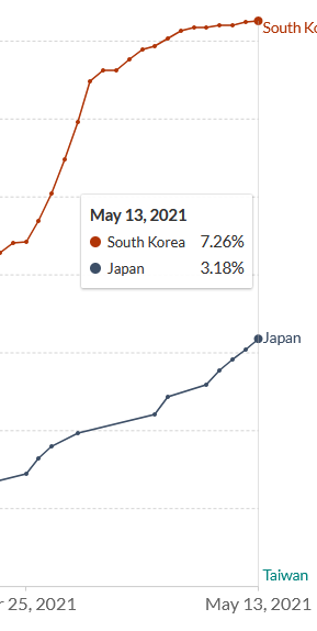 4月までに300万人とか目標を掲げたせいで足りなくなって5月から伸びなくなったのがはっきり現れてて笑う韓国は協定違反。