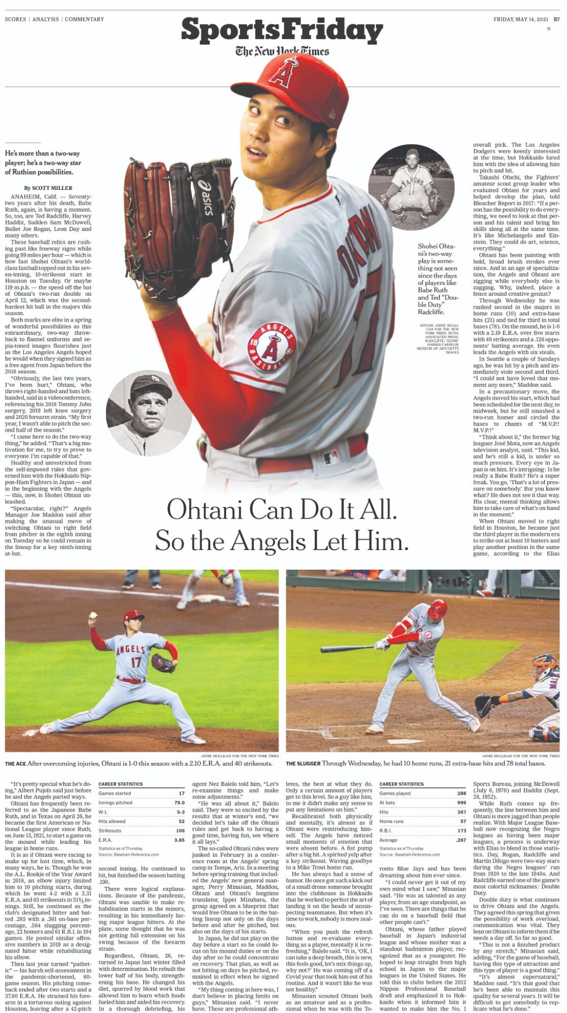 実際の特集紙面を、同紙スポーツ部の編集者ベンジャミン・ホフマン氏が自身のツイッターに公開。電子版の記事では「彼はただの二刀流ではない。ルースになれる可能性を持った二刀流スターだ」「肉体的にも精神的にも鍛え上げられたオオタニは以前とは変わってきた。ヒットを打った後のガッツポーズ、奪三振後の吠え、マイク・トラウトの本塁打に手を振るなどの姿を見せている」などと紹介されている。