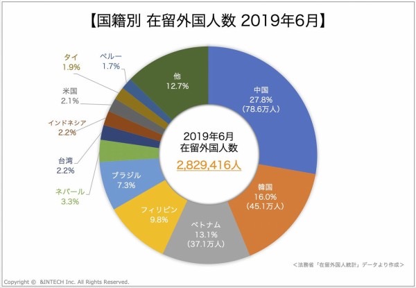 국적별로는 중국이 110만1782명으로 43.6%를 차지한다. 이 가운데 70만1098명(63.3%)은 이른바 조선족이라고 불리는 한국계 중국인이다.