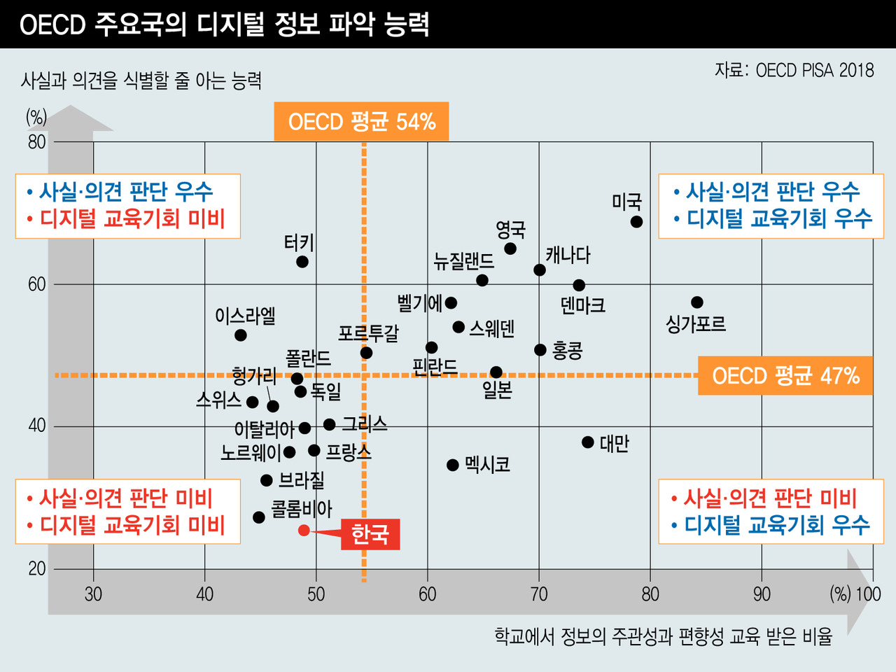 OECDが3日(現地時間)に発表した報告書「PISA 21世紀の読者たち:デジタル世界における読解力の開発」によると、韓国の満15歳の生徒(中学3年、高校1年)たちは、詐欺性の電子メール(フィッシングメール)を識別する能力の評価において、OECD諸国の中で最も低い水準を記録した。朝鮮人の敵は朝鮮人。