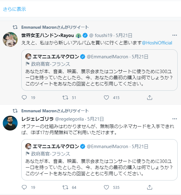 프랑스 대통령 마크롱이 어린이들에게 지원금 300유로를 제공하고 트위터에 이 돈을 문화생활에 사용할 수 있다며 어디에 사용할 것인지 묻는다.